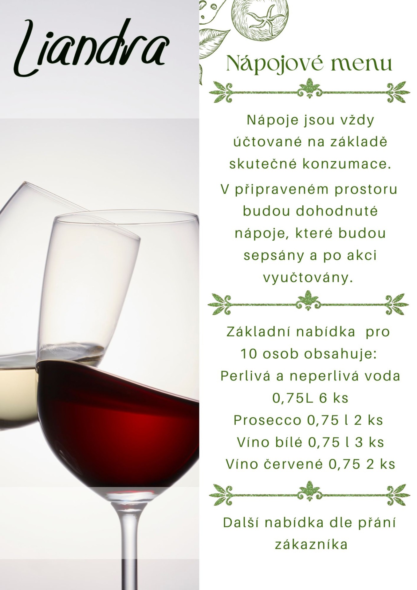 Nabídneme vám oddělený prostor pouze pro vaši společnost, kde na vás bude čekat připravený raut s nápoji. Dopřejte si možnost zpomalit tempo dne, naladit se na příjemnou atmosféru a zahájit pohodový večer právě u nás.
